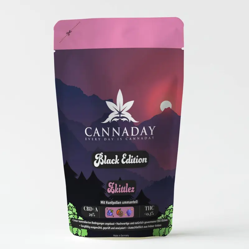 Erlebe die unvergleichlichen Zkittlez 29% CBD-Blüten – Black Edition, veredelt mit einer hochwertigen Schicht aus reinem CBD-Hanfpollen. Diese außergewöhnlichen Indoor-Top-Shelf-Blüten vereinen herausragende Qualität, intensives Aroma und eine beeindruckende CBD-Konzentration von 29 %. Für alle, die das Beste erwarten.
